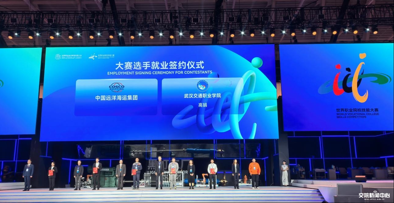 世界职业院校技能大赛冠军总决赛11月21日晚在天津国际会展中心举行,在人民网、央广网、中国网、津云、网易天津等同步直播。冠军总决赛共由74个国家、2701 所职业学校和机构、8121支参赛队伍、29182名选手产生。在总决赛结束之后,是大赛获奖选手就业签约仪式,来自6个职业院校的大赛获奖学生和6个企业的领导上台,在观看电视直播的亿万观众面前,签订了就业协议,我校2022级港口航运专业学生高娟与中国远洋海运集团上海中远海运集装箱运输信息服务有限公司总经理刘超就在其中。